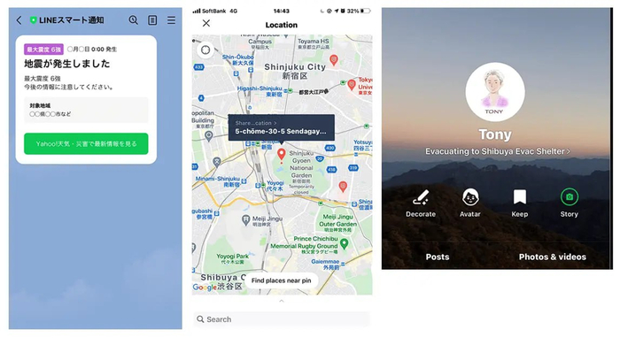 в LINE встроена интерактивная карта больниц, укрытий и других чрезвычайных объектов с информерами и полезными советами.