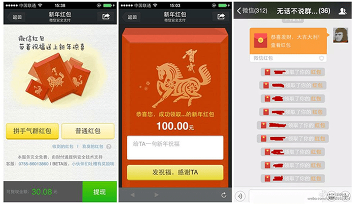 В конце декабря 2014 года WeChat запустил цифровой аналог hongbao. Они сделали мини-приложение, где можно отправлять виртуальные красные конверты. Условный мистер Ли отправлял такой конвертик своему племяннику Сяо, и Сяо получал юани в свой кошелек WeChat Pay. Если у Сяо не был установлен WeChat, то ему… приходилось его установить, чтобы всё-таки получить заветные денежки. При этом конверт можно было отправлять лично (как личное сообщение), а можно было закинуть в групповой чат — тогда сумма равномерно распределялась по кошелькам участников чата. Через групповой вариант можно было поздравить коллег или родственников. Но чтобы получить деньги — нужно обязательно установить WeChat.