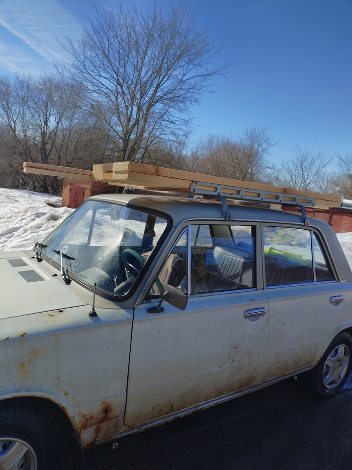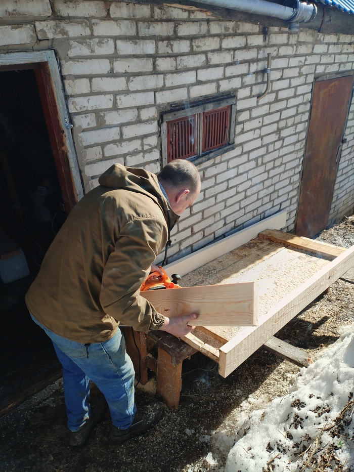 Погода, кстати, великолепная. Солнечно, тепло… Я без куртки и без шапки хожу, чтобы не потеть. Но от снега ещё немного холодом натаскивает. Останавливаешься — зябко становится. Стараюсь на холодном не сидеть. Да сидеть-то особо некогда : я с утра на своей Маруське досок привезла. Работаем.