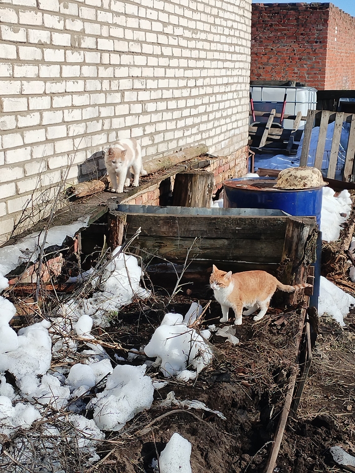 Для тех, кто спрашивал про донаты, всё работает. Но если только ваше желание, я специально ничего не прошу. Всё, что приходит, идёт на них вот, на животных, на капусту им, морковь, тыкву, пока травы нет, во имя жизни на земле, и вот в Маруську идёт, в машину — потому что это всё существует, пока она на ходу. Сейчас лужи по полколеса по дороге сюда, а по сторонам отвалы изо льда — пешком сюда не пройти. Сапогов таких нету у меня, чтобы мне пройти.
