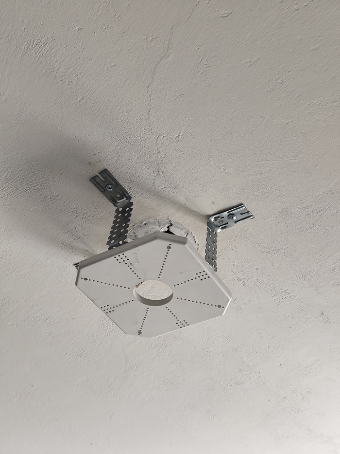 Багет в этот раз не заказывал — остался с прошлого раза. Цена — около 25 рублей за метр, т.е. ещё + 300 рублей. Закладная под люстру около 100 рублей, тоже была в наличии.