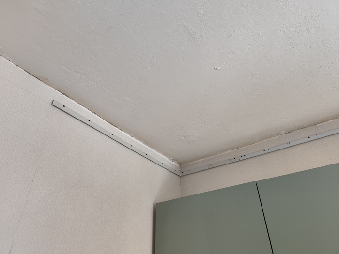 Самое сложное и бесячее это прикрепить багет по периметру помещения. Закрепляется по уровню. Это выглядит примерно так: