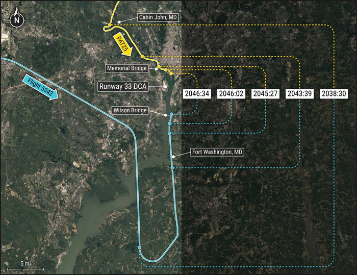 Вечером 29 января 2025 года самолёт Bombardier CRJ700, принадлежавший авиакомпании «PSA Airlines» (выполнял рейс для «American Airlines»), вылетел из Уичито (Канзас) в Вашингтон. На борту находились 60 пассажиров и 4 члена экипажа. Полёт проходил без происшествий. Уже в темноте самолёт подлетал к аэропорту имени Рональда Рейгана и экипаж готовился к посадке.
