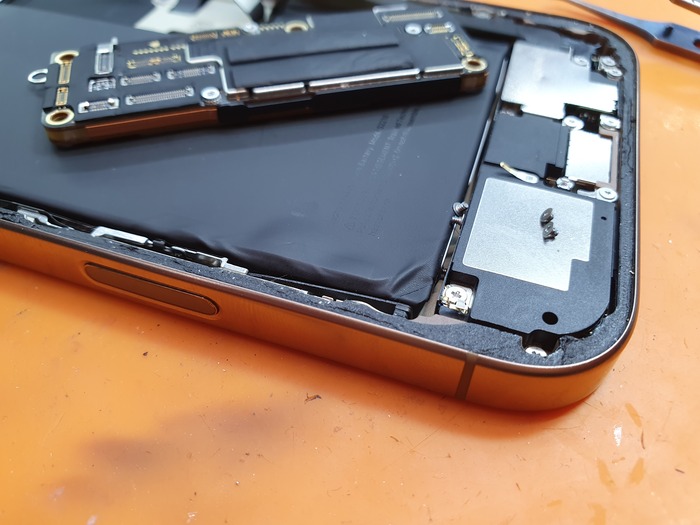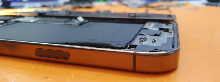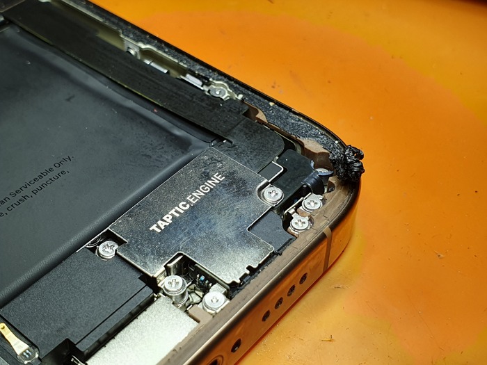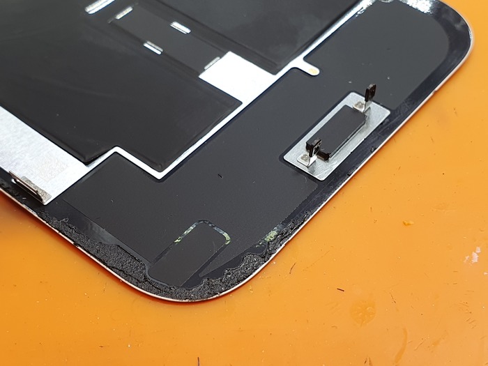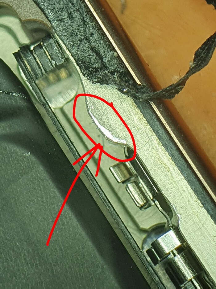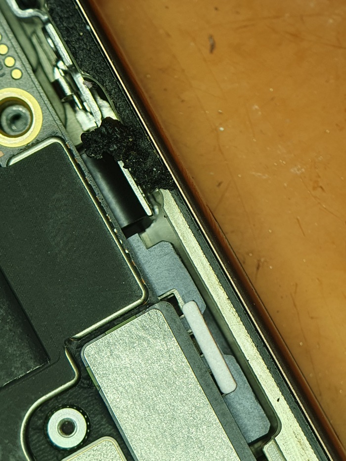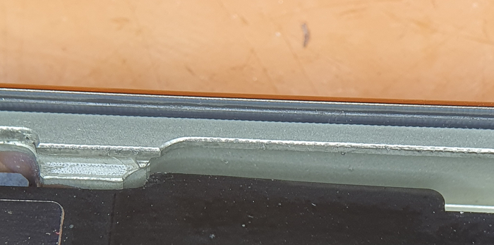 А вот место, где был повреждён аккум. Там поднимали его лопаткой так, что оставили замятину на корпусе и пришлось её срезать немного. Мелочь, но исправить нужно, иначе при незначительном воздействии на эту область крышка может лопнуть или поцарапаться.