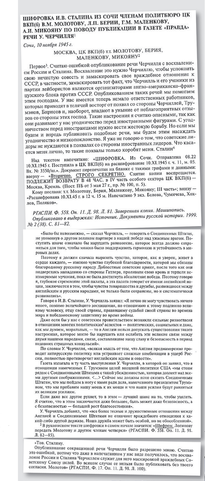 «Считаю ошибкой опубликование речи Черчилля с восхвалением России и Сталина. Восхваление это нужно Черчиллю, чтобы успокоить свою нечистую совесть и замаскировать свое враждебное отношение к СССР, в частности, замаскировать тот факт, что Черчилль и его ученики из партии лейбористов являются организаторами англо-американско-французского блока против СССР. Опубликованием таких речей мы помогаем этим господам. У нас имеется теперь немало ответственных работников, которые приходят в телячий восторг от похвал со стороны Черчиллей, Трумэнов, Бирнсов и, наоборот, впадают в уныние от неблагоприятных отзывов со стороны этих господ. Такие настроения я считаю опасными, так как они развивают у нас угодничество перед иностранными фигурами. С угодничеством перед иностранцами нужно вести жестокую борьбу. Но если мы будем и впредь публиковать подобные речи, мы будем этим насаждать угодничество и низкопоклонство. Я уже не говорю о том, что советские лидеры не нуждаются в похвалах со стороны иностранных лидеров. Что касается меня лично, то такие похвалы только коробят меня. Сталин».