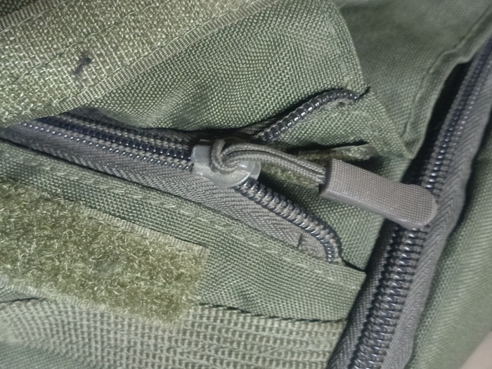 Благо, вдоль молний идут липучки и они хоть как-то спасают. Но это реально пиздец. Сумка, которую регулярно набивают до отказа, которая может летать по кузову Урала, как мячик, которую могут волочить по дороге километр… и вот такие всратые молнии ((