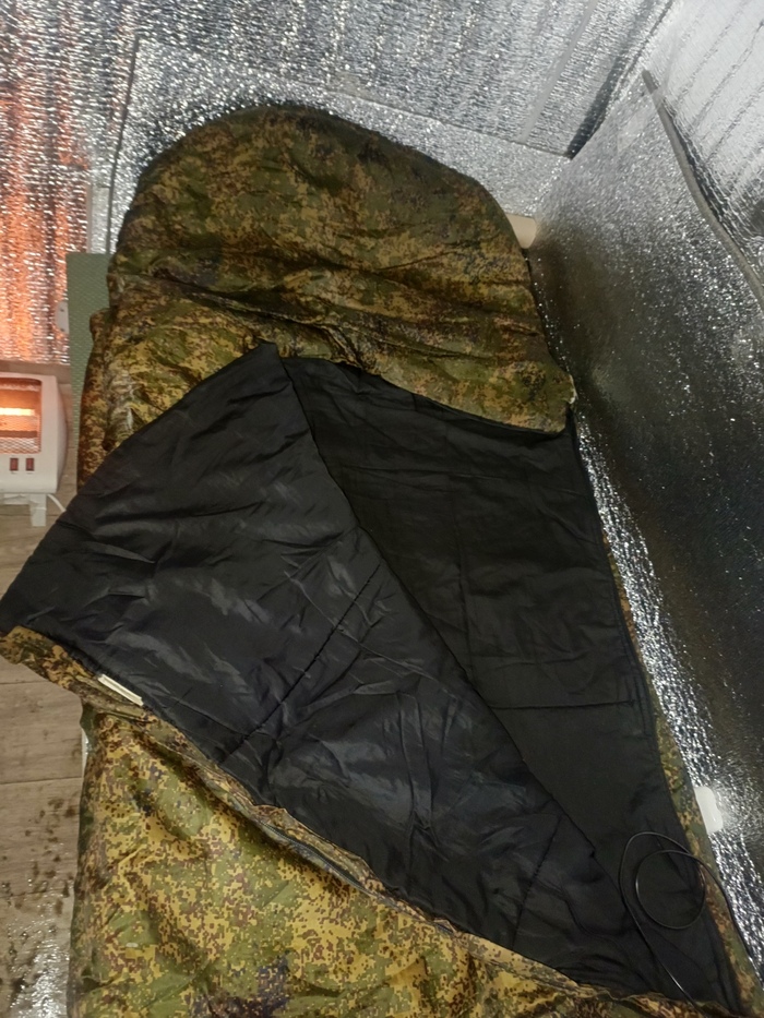 Первое — спальник. Стандартный уставной спальник, который получают или не получают, а находят все бойцы ВС РФ. Сам спальник шикарный. И по размеру хороший и теплый. Приходилось в нем спать при минусовой температуре, так потом даже жарко становилось. Залезаешь в него целиком и ебись оно всё конем. Пусть весь мир подождет. Вылезать не хочется.