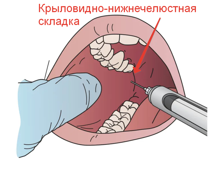 Игла вводится в полости рта, в зоне крыловидно‑нижнечелюстного пространства — это участок с внутренней стороны челюсти за зубом мудрости.