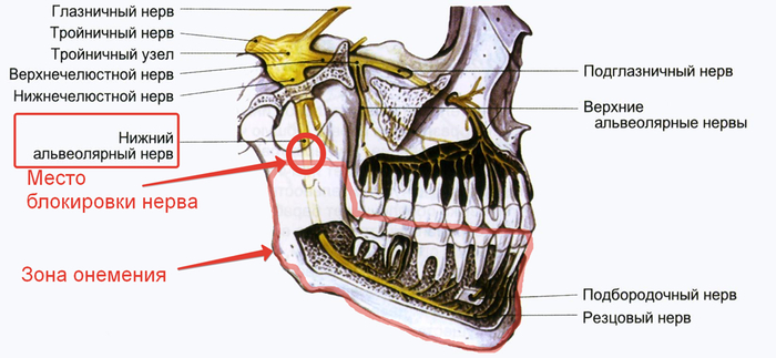 При лечении или удалении нижних моляров (шестых, седьмых и особенно восьмых зубов) простой инфильтрационной анестезии (когда укол делают рядом с зубом) недостаточно. Причина в особенностях строения нижней челюсти.