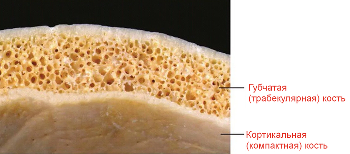 Внутренняя часть. Представляет собой пористую структуру, пронизанную сосудами и нервами. Более мягкая. Обеспечивает питание и гибкость кости.