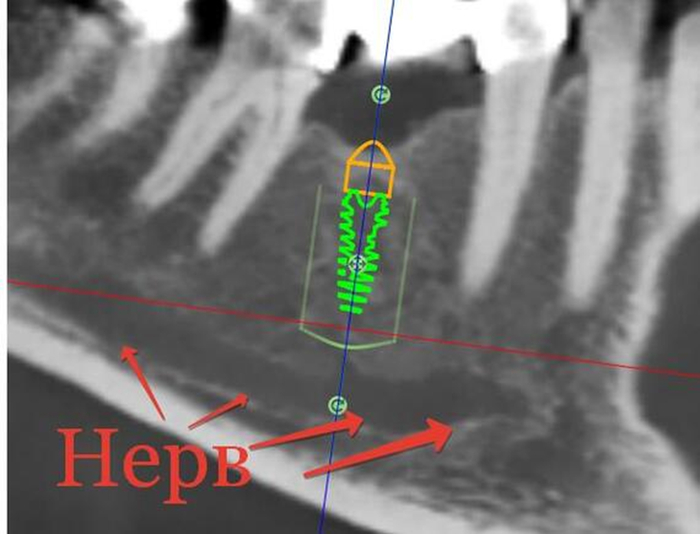 Он подходит к нижней челюсти с внутренней стороны, недалеко от сустава. Через небольшое отверстие входит в нижнечелюстной канал, который проходит в толще нижней челюсти. Да, этот тот самый «нерв», который мы боимся повредить при имплантации или удаления нижнего зуба мудрости. Ради него как раз и делается трехмерный снимок, чтобы точно определить его расположение до вплоть до 1 мм.