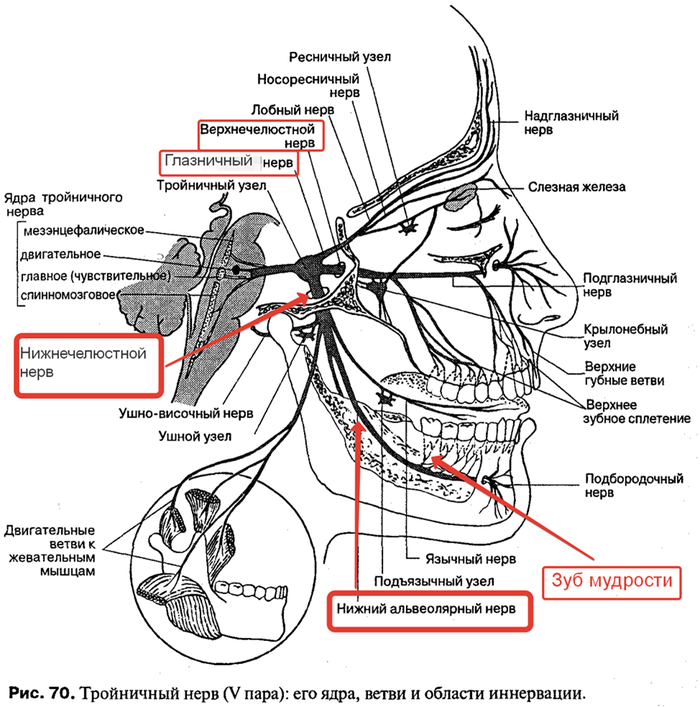 пара). Этот нерв отвечает за передачу болевых, температурных и тактильных сигналов от зубов, дёсен, части слизистой оболочки рта и даже участков нижней губы.