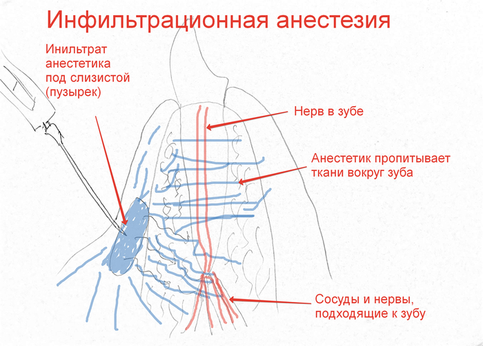 Представляет собой укол в десну возле зуба. Создаем под ней «пузырек» из анестетика, который пропитывает окружающие ткани, выключая нервные окончания, которые подходят к зубу.