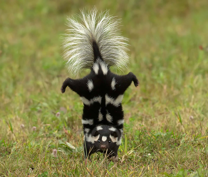 Нас с вами такая поза скорее умилит, нежели напугает, однако приближаться к стоящему на передних лапах скунсу точно не стоит, ведь если устрашение позой не сработает, то далее в ход, скорее всего, пойдёт химическое оружие.