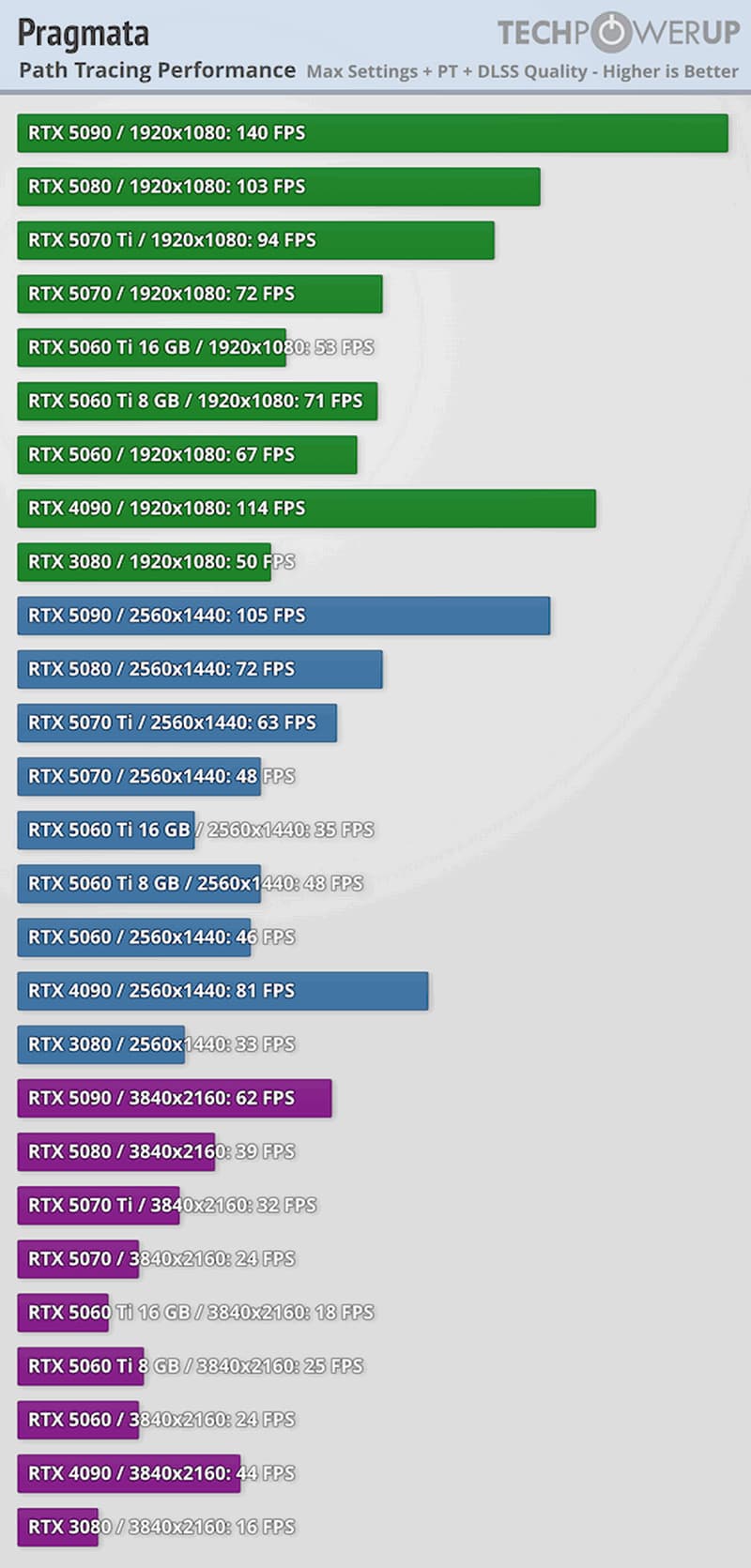 Вот этот режим уже очень требователен, но даже тут на RTX 5060 Ti 8GB в 1440p можно получить около 50 к/с, хотя уже с DLSS в режиме Quality. Также можно отметить аномалию: RTX 5060 Ti 16GB по какой-то причине заметно медленнее версии с 8 ГБ.