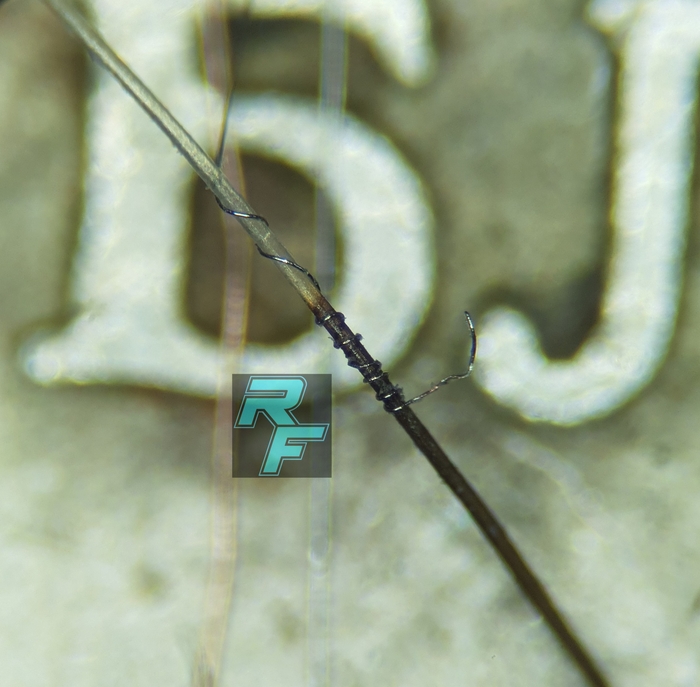 А есть ещё проволока 0.004мм. Вот она в сравнении с моим волосом с головы:
