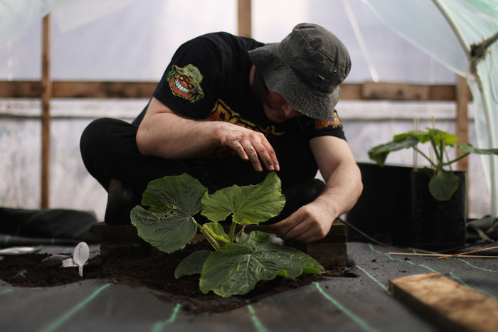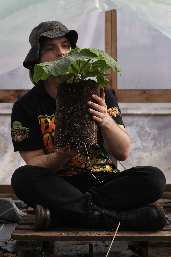 Рассада тыкв росла в специальных пакетах, так что нужно было только выкопать лунку, разрезать пакет и аккуратно поместить ростки прямо туда. Да, туда.