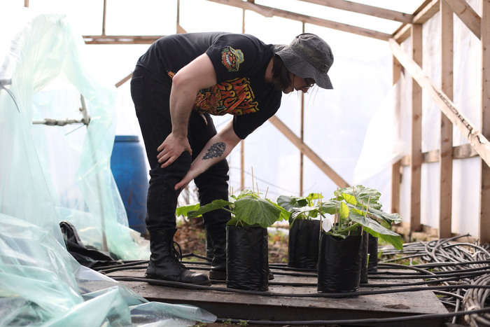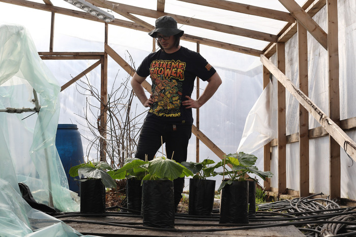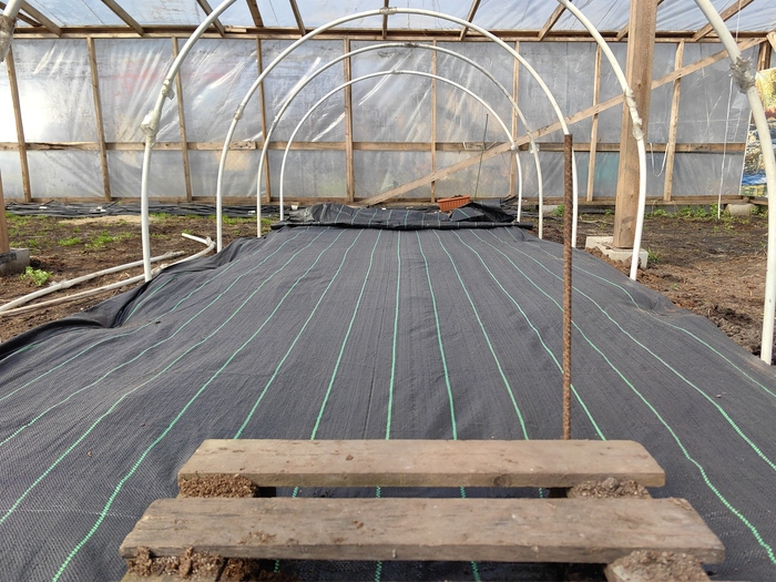 В этом году я решил застелить всю теплицу агроволокном от сорняков. Тут свои плюсы и минусы. Плюсы, конечно же, будут заключаться в отсутствии сорняков. Когда они растут под листьями тыквы, то это создаёт препятствия для циркуляции воздуха, влажность повышается, и как следствие, растение начинает болеть. Но при этом мне придётся делать прорези под каждое междоузлие, чтобы тыква пускала корни. Данный процесс сильно увеличит время, которое будет уходить на обслуживание этих растений. С другой стороны, я сражаюсь за результат, а не за время.