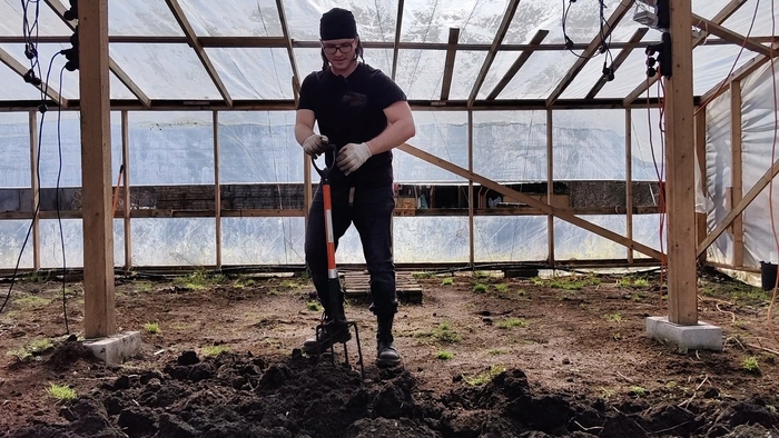 Размер моей теплицы 16 на 10 метров. Получается 160 квадратных метров, и на этой территории будет расти две тыквы, а значит, делим ее пополам и получаем 80 квадратных метров на одну тыкву. С прошлого года в земле зарыт греющий кабель, я не стал его выкапывать, да и зачем? Раз уж все равно буду опять тут тыквы сажать, то пусть лежит. Тем более нет надобности копать огромную яму и наполнять ее удобрениями. Всё питание достаточно вносить в верхний слой земли, примерно до 30 см. Примерные участки быстро наметил и пора в них запихнуть изрядное количество удобрений. Ничего нового придумывать не буду, надо использовать то, что уже работает, и только улучшать определенные моменты. Например, в прошлом году я внес на начальной стадии мало удобрений, и пришлось постоянно подсыпать, чтобы растения развивались должным образом.