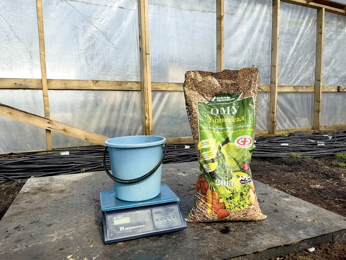 В общем, я взял мешок Буйских удобрений, а именно ОМУ Универсал, и рассыпал по земле из расчета 500 грамм на каждый квадратный метр.