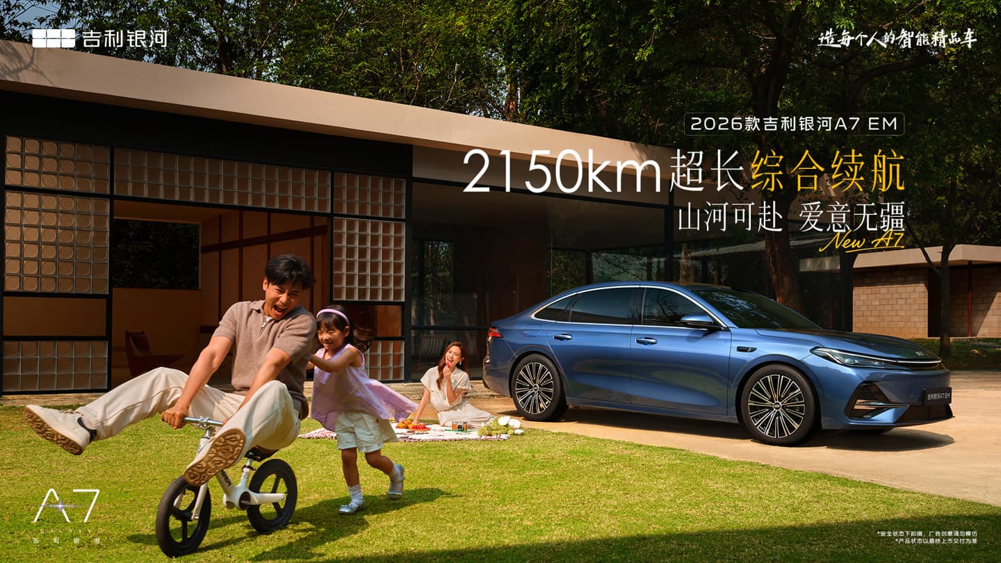 Geely Automobile опубликовала изображения гибридного семейного седана Geely Galaxy A7 EM 2026 модельного года. Как отмечает сама компания, колесная база составляет 2845 мм, а расход топлива в режиме поддержания заряда составляет примерно 2 литров на 100 км пути. На чистом электричестве автомобиль сможет проехать до 235 км, суммарный запас хода — 2150 км.
