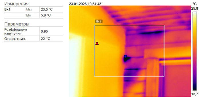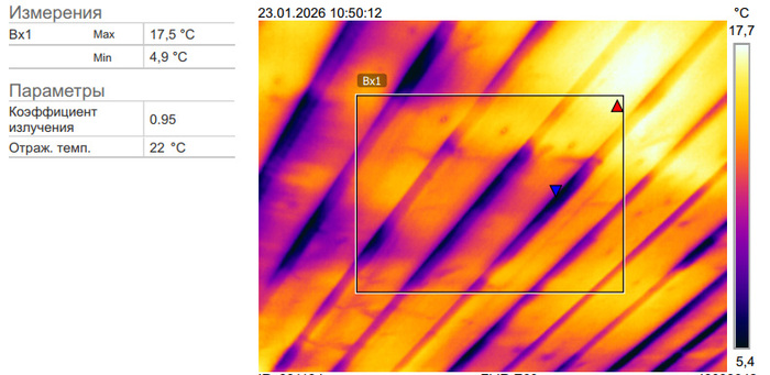 Это хуже, чем постоянный приток с одной скоростью, т.к. показывает зависимость притока от скорости ветра за окном. А это значит, что стена продувается. И скорее всего, не только она. Глянем на потолок этого помещения в тепловизионном обследовании от моего коллеги, которого вызывали в январе, когда перепад температур был побольше.