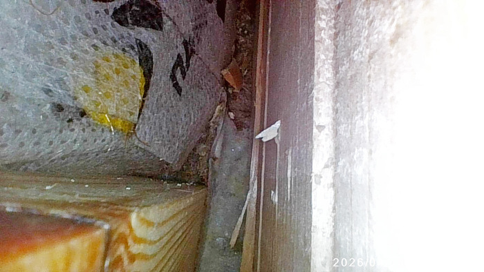 Ладно, переходим к практике. Сначала осматриваем то, что можно осмотреть глазами. И видим, что в уголке внешних стен нам машет кусочек непроклеенной пароизоляции.