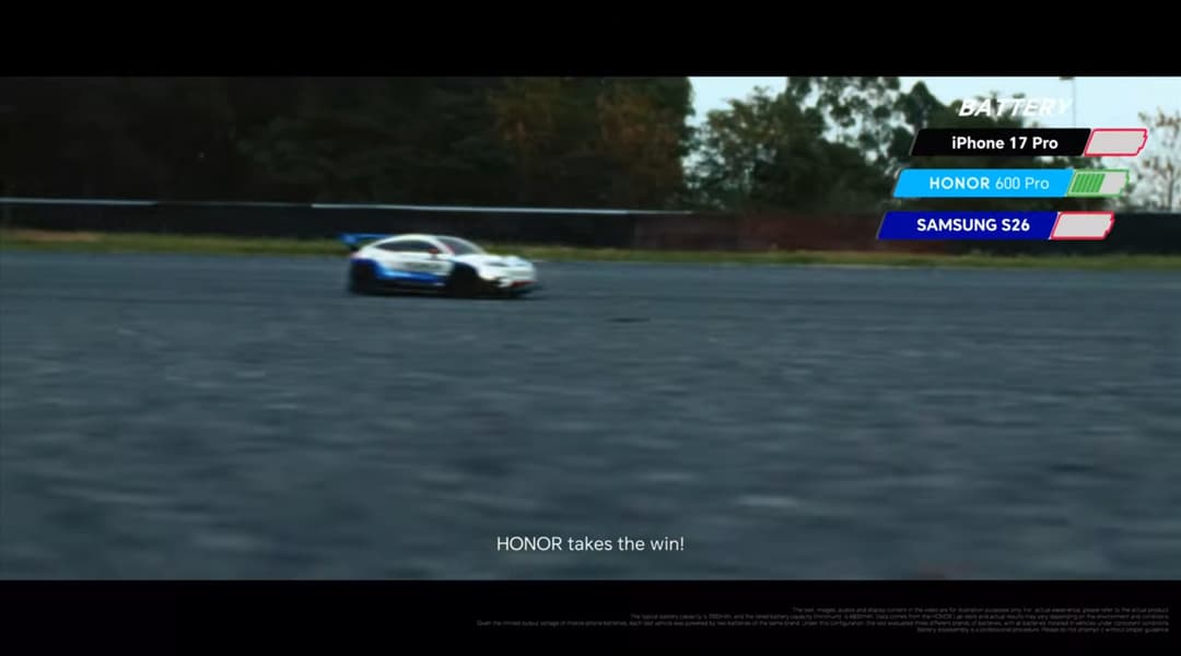 Honor опубликовала видеоролик с очень необычным тестом автономности нового Honor 600. Вместо привычного сравнения времени работы смартфонов в стандартных сценариях, инженеры бренда использовали аккумуляторы трёх устройств как источник питания для миниатюрной радиоуправляемой машинки. В испытании участвовали батареи от Honor 600 с ёмкостью 7000 мАч, а также аккумуляторы условных iPhone 17 Pro (4252 мАч) и Samsung Galaxy S26 (4300 мАч).